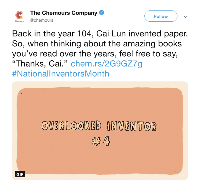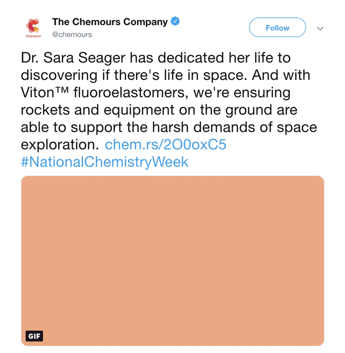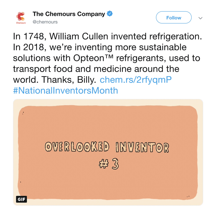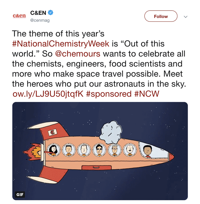 We ended up making two original song-and-animation videos for Chemours. One for National Inventors Month that toasted the overlooked inventors, the underdogs whose inventions we use every day, but never knew their names. And then we made another video for National Chemistry Week that toasted all the undersung heroes of space travel. In addition to the full song and video, we also made gifs that highlighted individual people.